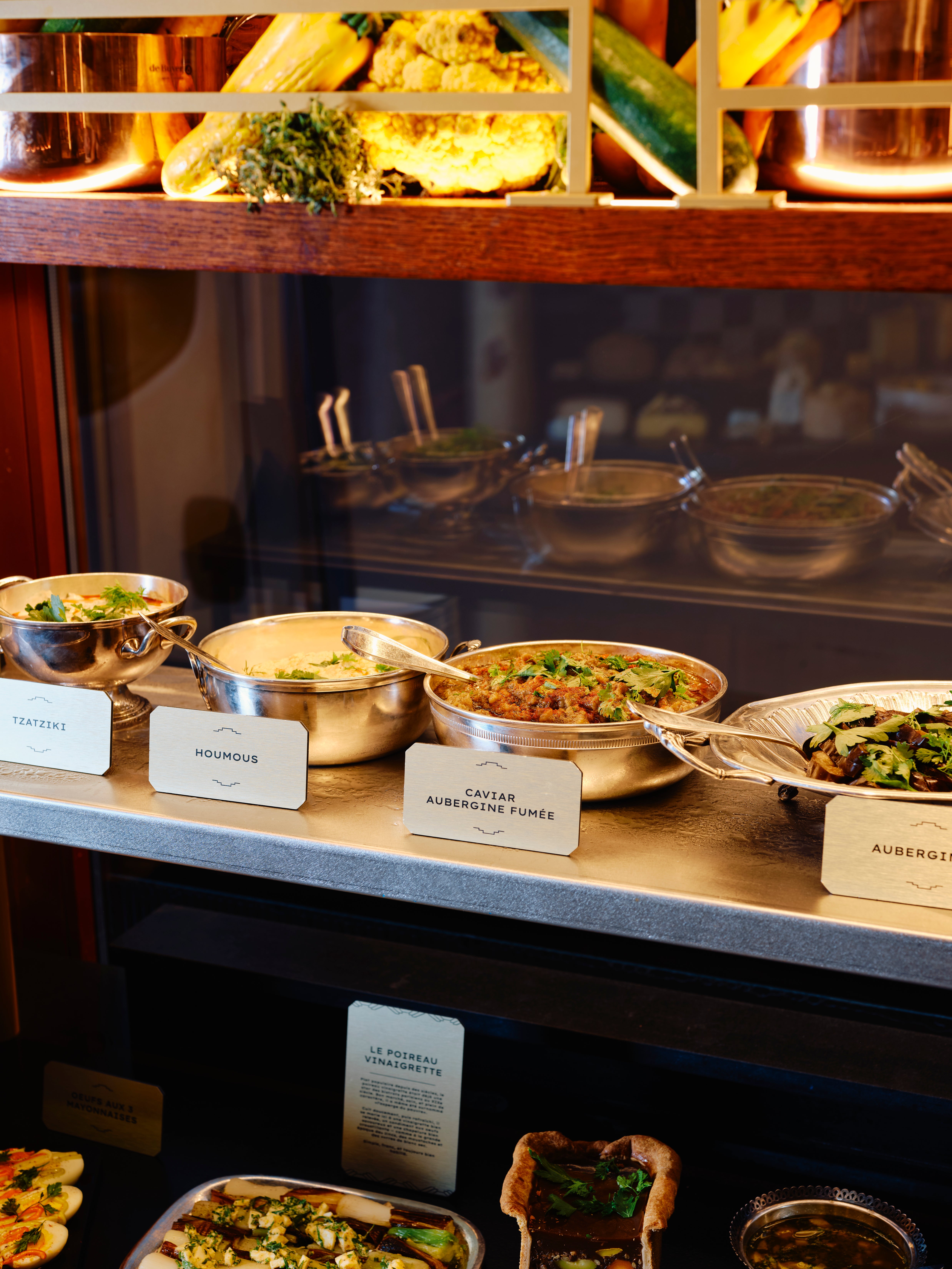 Sur plus de 500 m² et réparti sur deux niveaux, le buffet propose une centaine de préparations réparties en comptoirs thématiques : écailler avec crustacés et gravlax, fromager avec une vingtaine de fromages, maraîcher avec salades et légumes du moment, charcuterie artisanale, boulangerie chaude ou encore pâtisseries gourmandes pour finir sur une note sucrée.