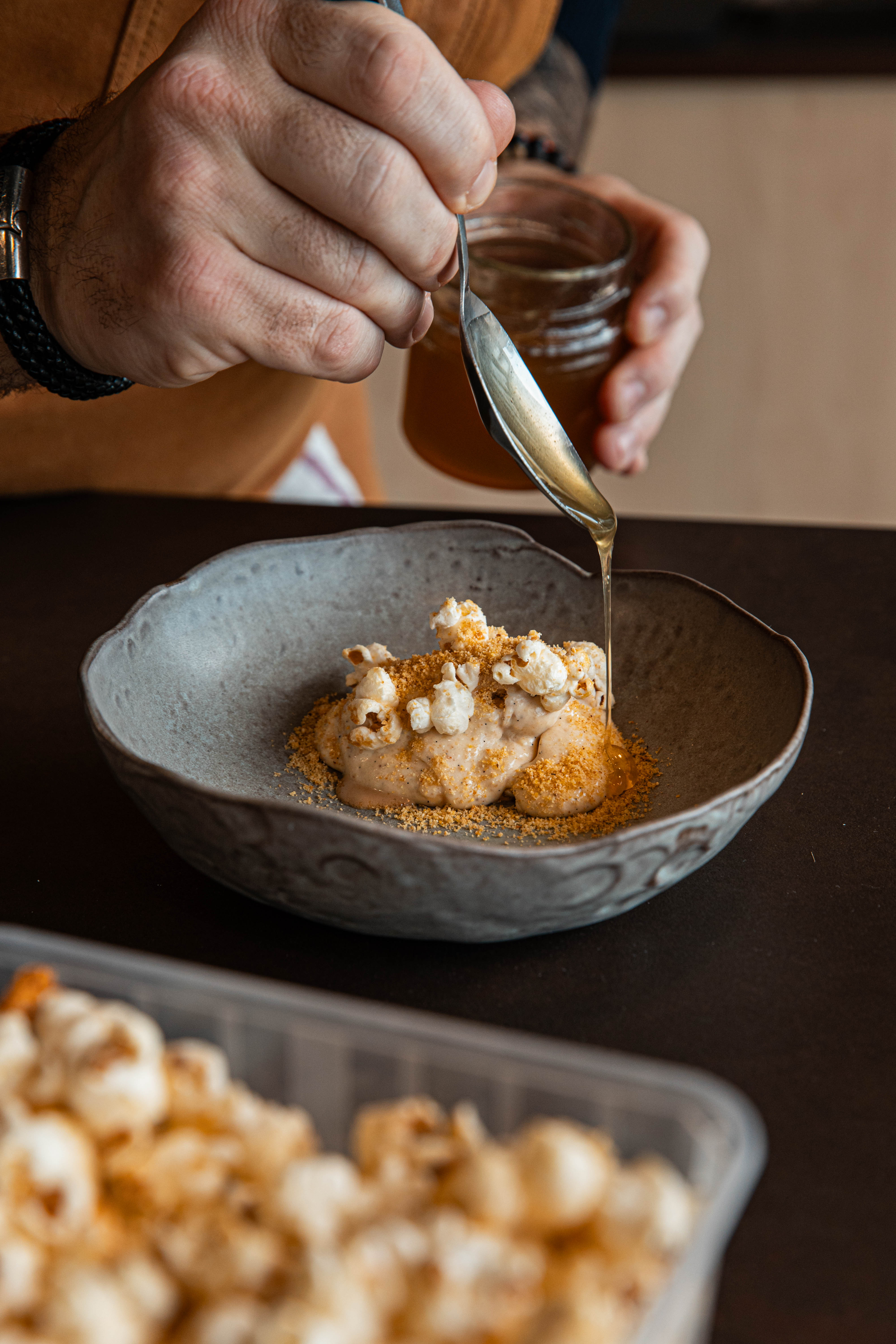 Pour réaliser ce “miel”, il suffit de “concasser les céréales assez finement, les plonger dans quatre fois leur volume d’eau et de cuire entre 70 et 80°C. Quand le mélange retombe à environ 60°C, on ajoute l’orge malté et une réaction chimique s’opère, la liquéfaction est presque immédiate. On travaille la matière de 4h à 6h à 65°C jusqu’au déphasage. On récupère alors le liquide que l’on fait réduire comme une confiture, jusqu’à obtenir la bonne densité”, explique Julien Allano, qui précise qu’il conserve la matière sèche pour en faire une poudre d’assaisonnement sucrée.