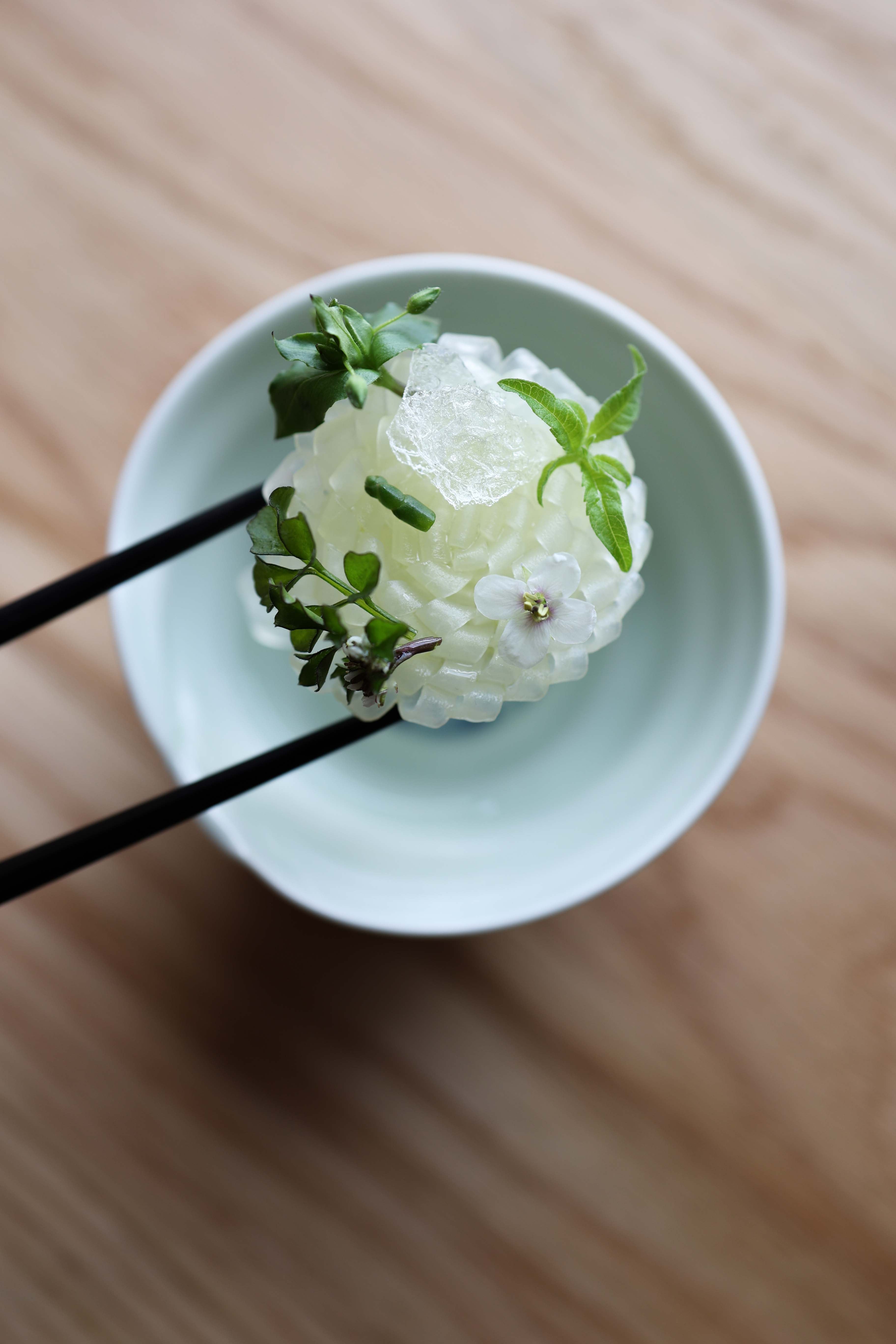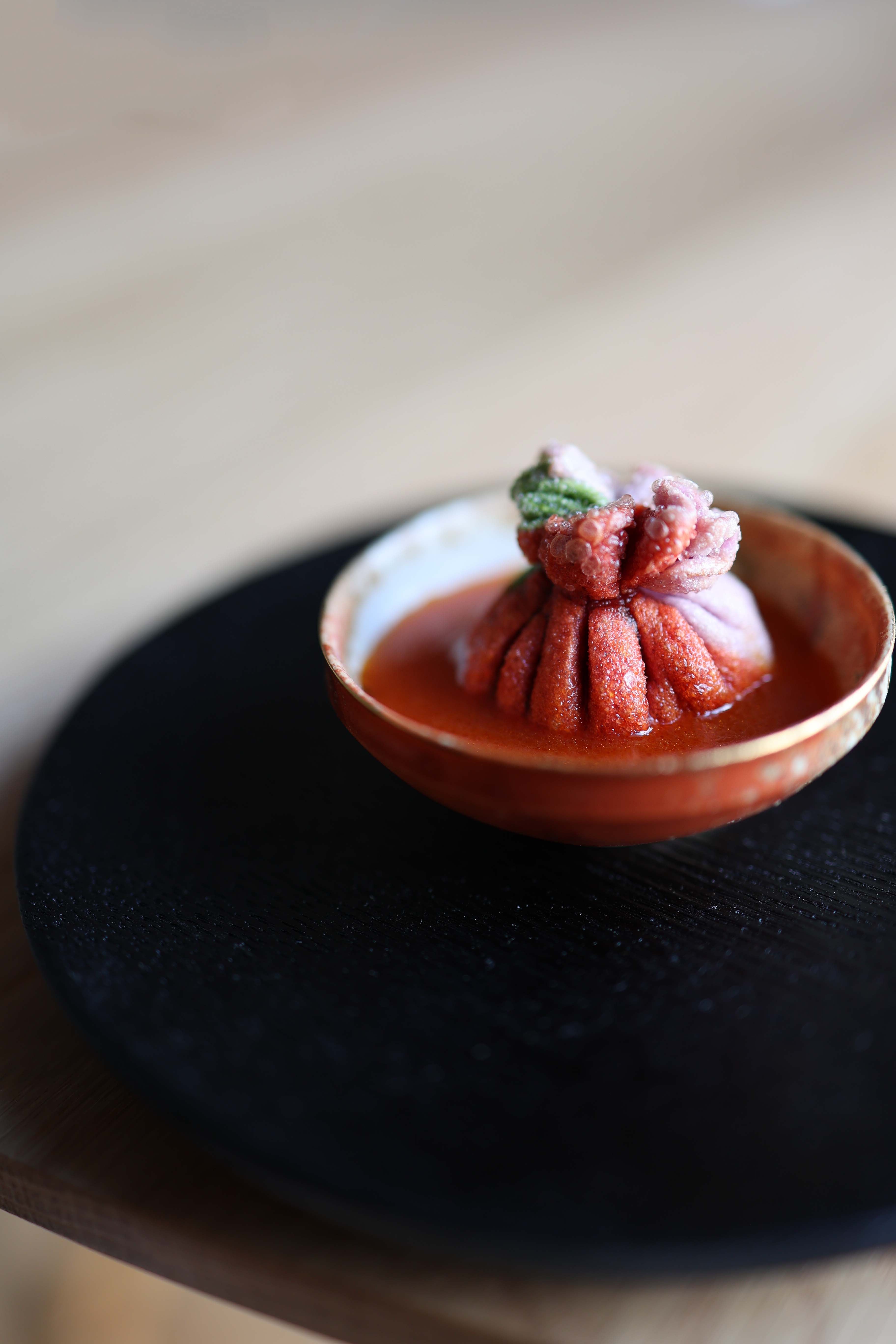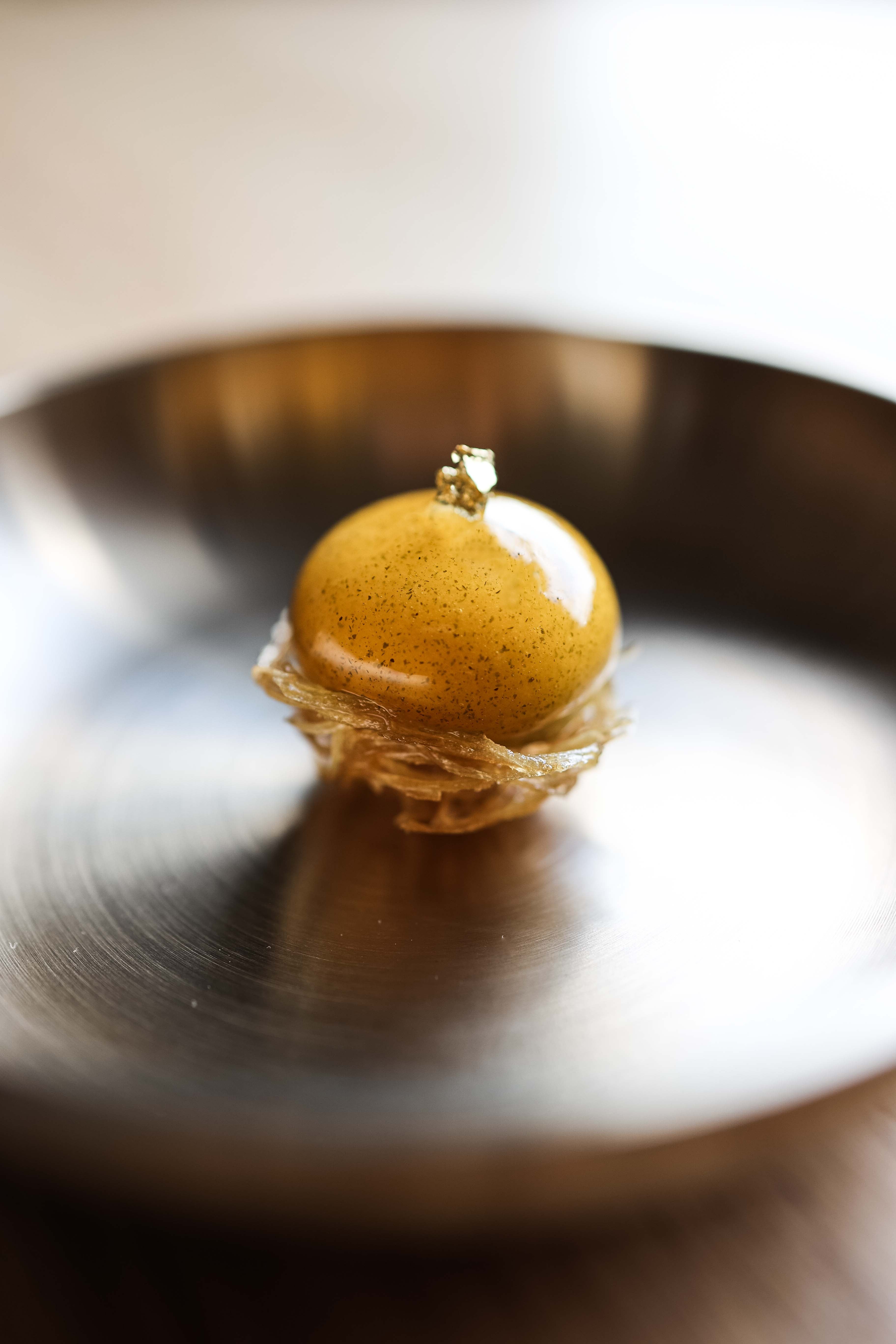 Le menu représente le fruit du voyage culinaire de Baumann, empreint de créativité mais respectueux de la tradition comme le kimchi blanc, qui est servi dans des œuvres d'art en céramique par un potier coréen, qui a intégré des fragments de poterie de la dynastie chinoise Qing dans la nouvelle porcelaine. Le riz, bien sûr, joue un rôle important dans l'offrande et est cuit dans une marmite en fer traditionnelle, un gamasot coréen.