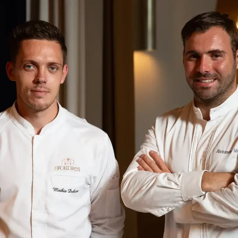 Le chef Mathis Debize et le chef pâtissier Alexandre Mornet travaillent côte à côte depuis un an aux Foudres, le restaurant gastronomique de l’Hôtel Chais Monnet et Spa, une étoile au guide rouge depuis 2021 et de deux toques au Gault & Millau. Situé à Cognac et ouvert depuis octobre 2018, cet hôtel cinq étoiles luxueux et contemporain est né à la place d’un ancien site datant de la première moitié du 19e siècle et classé au patrimoine industriel, niché dans parc verdoyant. Au cœur de l’établissement, ayant récemment obtenu deux Clefs Michelin, se trouve un ancien chais centenaire dit « Cathédrale » : c’est ici qui se situe sa table gastronomique, Les Foudres.