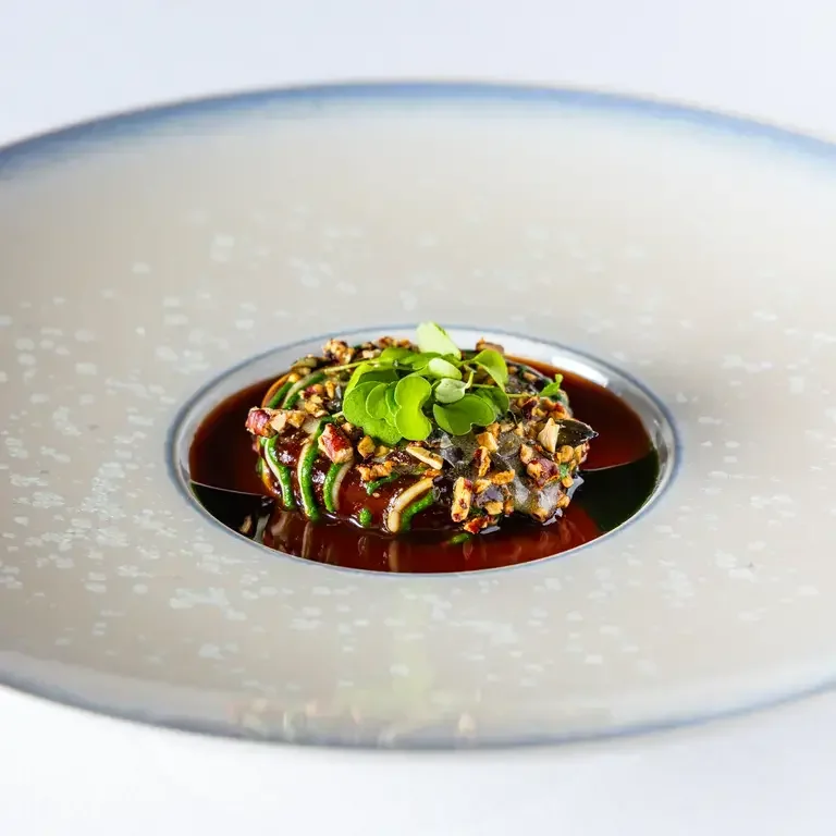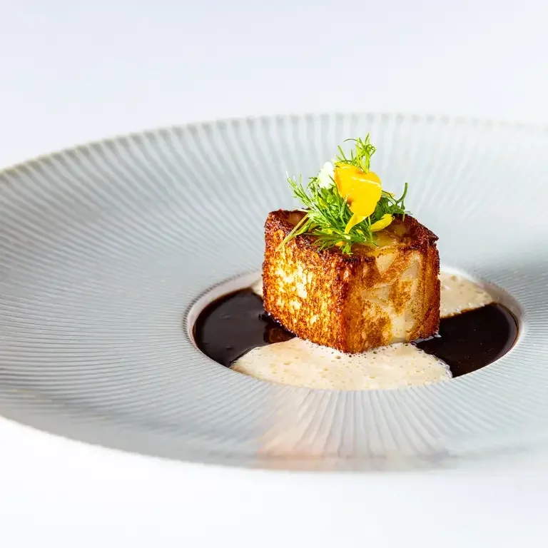 Ses plats, nourris d’exigence, s’attachent à faire vibrer chaque produit avec justesse. Poissons maturés pour révéler toute leur profondeur, sauces soyeuses et puissantes, vinaigres bien choisis pour amener de l’acidité, un éclat, une tension. Il aime aussi les mariages inattendus, mais toujours intelligents, toujours assumés. Un écrasé de pomme de terres marié aux algues et au caviar, entre rondeur et iode ; une lotte maturée comme un grand fromage accompagnée d'une triple sauce ou une truite locale travaillée en gravlax et réveillée par quelques pickles et une sauce herbacée et acidulée... Les saveurs sont franches, les assiettes élégantes. Et l’émotion, parfois, surgit là où on ne l’attendait pas.