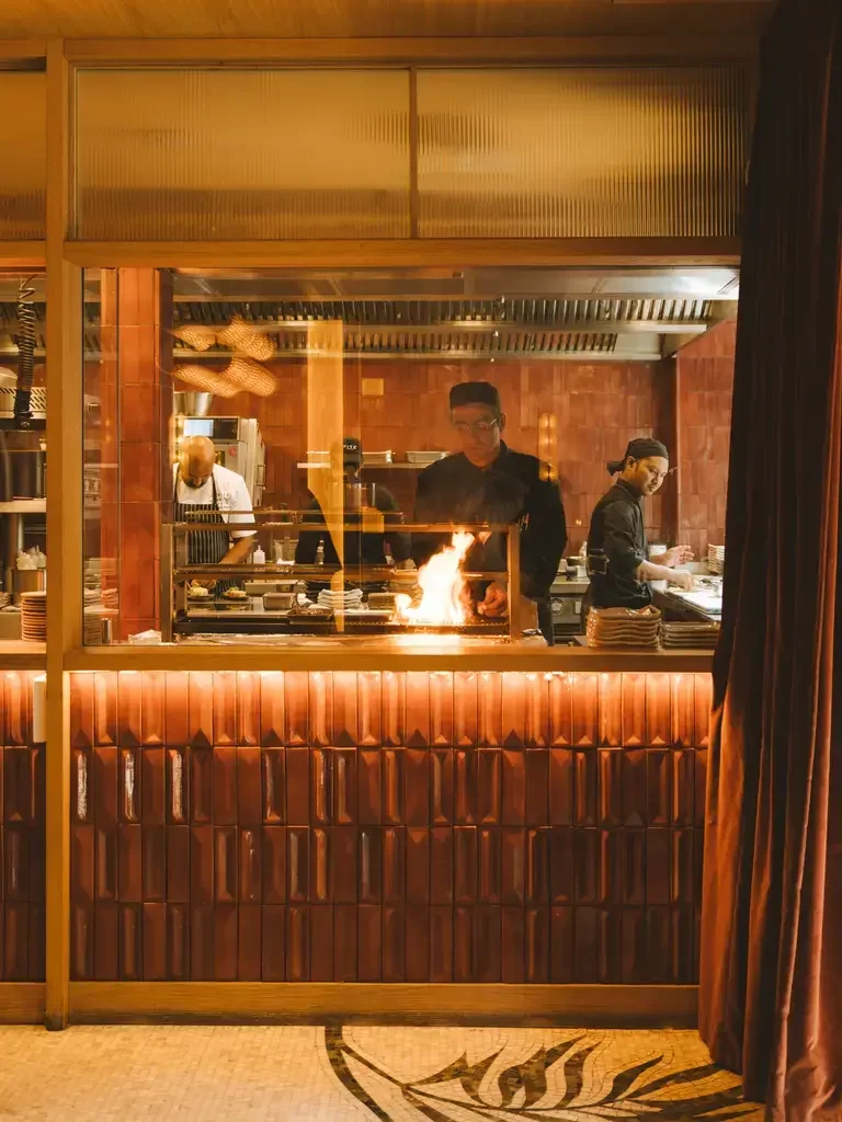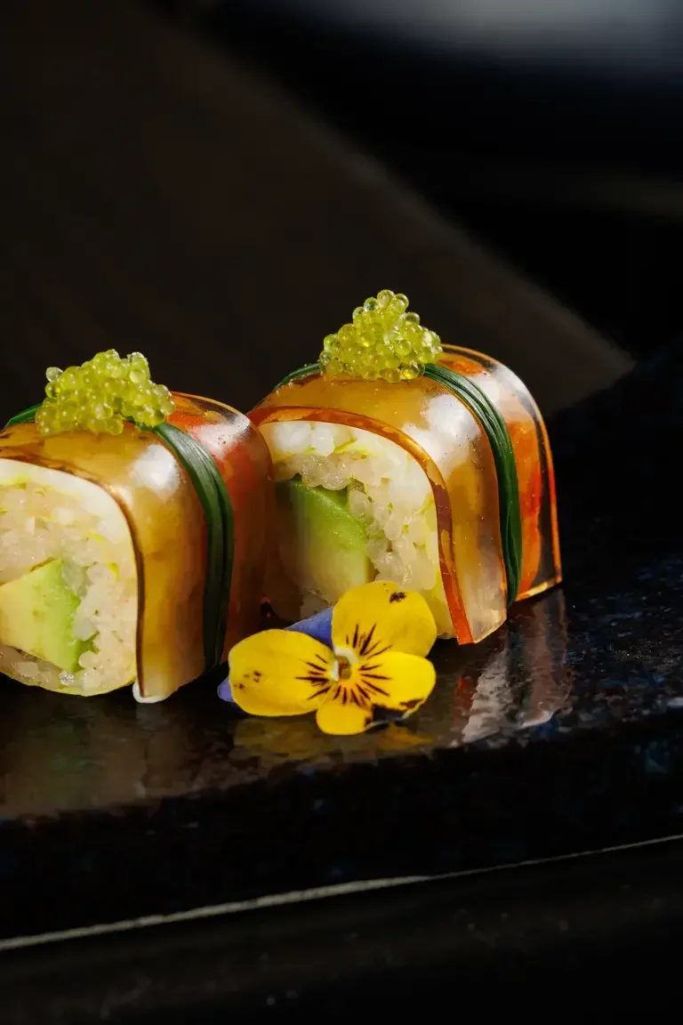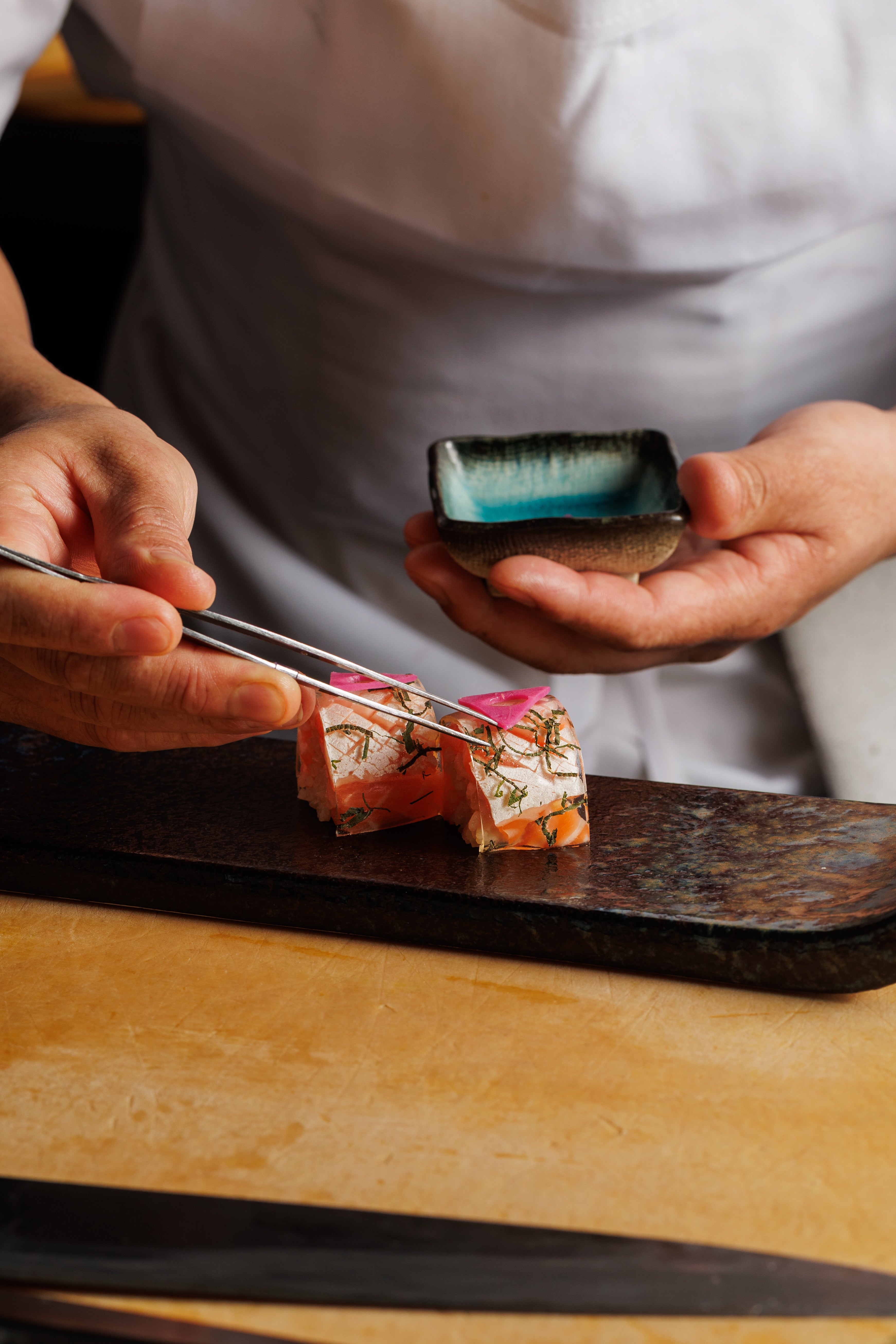 Situé au 7ᵉ étage du 26 avenue des Champs-Élysées, Aqua Kyoto est la première adresse française du groupe Aqua Restaurants, fondé à Hong Kong en 2000 par David Yeo présent dans plusieurs villes autour du monde (Londres, New York, Miami et Dubaï), et désormais célèbre pour sa cuisine japonaise contemporaine. Une ouverture très attendue par les amateurs de gastronomie japonaise et d’adresses stylées, qui trouveront en ce nouveau lieu parisien bien plus qu’un restaurant. Un ascenseur aux lumières rouges vous amènera directement dans l’univers envoûtant de cet établissement au charme raffiné dont le décor a été conçu par le le studio Yodezeen. L’eau, élément de vie et symbole du groupe Aqua, est le fil rouge qu’on retrouve dans plusieurs détails du design et dans les jeux d’ombres et de lumière, comme dans un theatre japonais. Suivant la tradition Omakase, au centre de la salle du restaurant trône un grand comptoir derrière lequel les chefs orchestrent en direct, créant avec précision assiettes et drinks sous les yeux des clients curieux. Un spectacle qui fait partie de l’expérience inoubliable du restaurant, tout comme sa vue à couper le souffle, à regarder depuis la terrasse panoramique ouverte toute l’année.