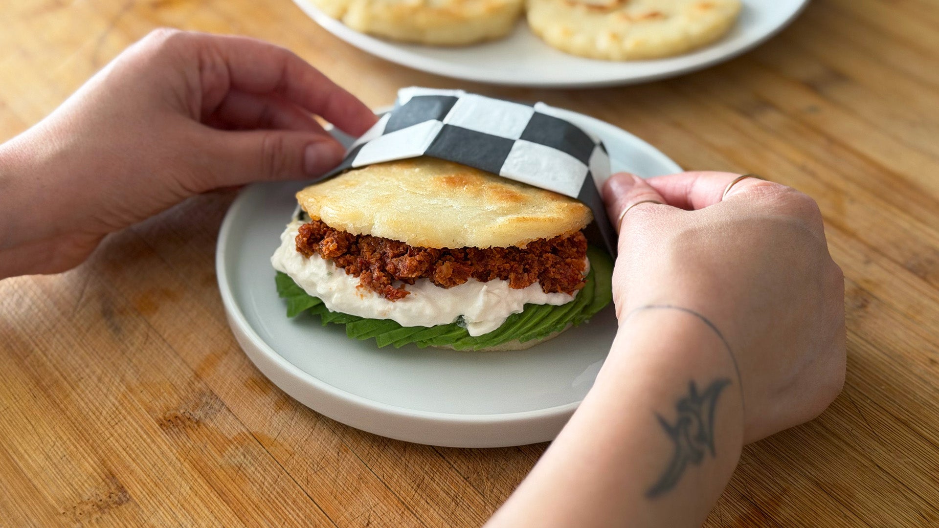 Couper les arepas en deux en laissant une extrémité du disque attachée. Garnir avec de l’avocat, de la burrata, du pesto rouge et servir.